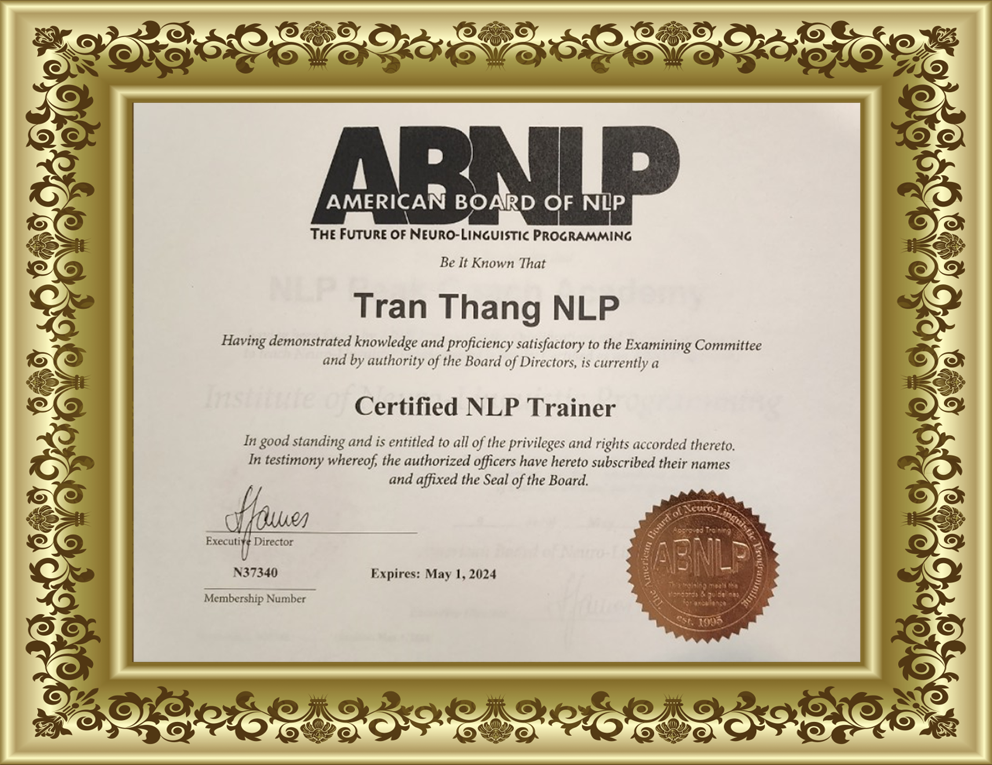 Với tư cách là thành viên hội đồng chứng nhận NLP Thế Giới – ABNLP Nguyên Chủng Hoa Kỳ (01 tổ chức lớn nhất hành tinh về NLP), TÔI có đủ tư cách ký bằng chứng nhận quốc tế cho các Nhà Thực Hành NLP (NLP Practitioner), và Nhà Thực Hành NLP Cấp Master, Huấn Luyện Viên NLP Cấp Master (NLP Master Coach).